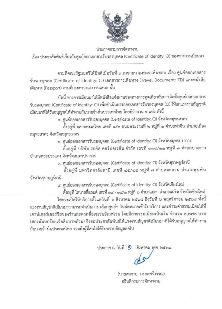 หนังสือประชาสัมพันธ์จากกรมการจัดหางานนี้ แจ้งเรื่องการจัดตั้งศูนย์ออกเอกสารรับรองบุคคล (Certificate of Identity: CI) ของทางการเมียนมา สำหรับแรงงานสัญชาติเมียนมาที่ทำงานในประเทศไทย