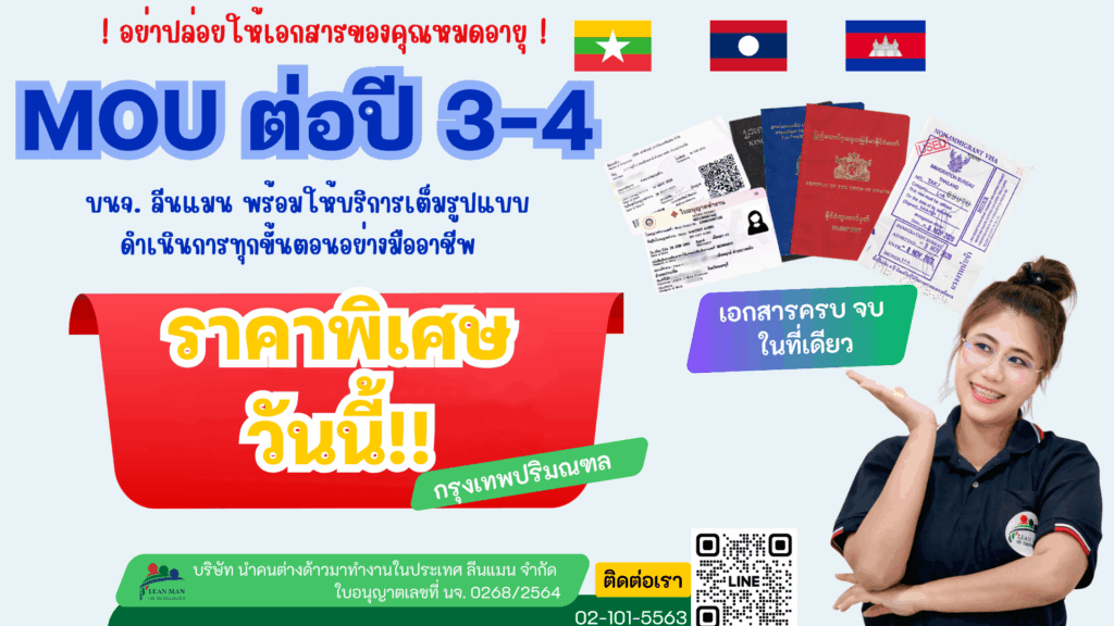 ต่อเอกสารแรงงานต่างด้าว ปีที่ 3-4 ต้องทำอะไรบ้าง? นายจ้างต้องรู้! 02-101-5563 ✅เมื่อแรงงานต่างด้าวทำงานในประเทศไทยจนครบ 2 ปีตามระบบ MOU แล้ว หากนายจ้างยังต้องการจ้างต่อ จำเป็นต้องดำเนินการ “ต่ออายุเอกสารปีที่ 3-4” ให้ถูกต้องตามกฎหมาย เพื่อป้องกันปัญหาการทำงานผิดกฎหมาย และหลีกเลี่ยงค่าปรับจำนวนมาก ✅ ทำไมต้องต่อเอกสารปี 3-4? ตามระบบ MOU แรงงานต่างด้าวจาก พม่า ลาว กัมพูชา จะได้รับอนุญาตทำงานในประเทศไทยเป็นระยะเวลา 2 ปีแรก และสามารถต่ออายุได้อีก 2 ปี รวมเป็น สูงสุด 4 ปี ต่อเนื่องได้ 1 ครั้งเท่านั้น โดยไม่ต้องเดินทางกลับประเทศ ✅เอกสารที่ต้องใช้ในการต่ออายุ หนังสือเดินทางของแรงงาน (Passport) Work Permit เดิม สำเนาสัญญาจ้างงานฉบับใหม่ สำเนาหนังสือรับรองบริษัท/ทะเบียนพาณิชย์ ใบตรวจสุขภาพ แบบ ตท.1 สำหรับต่ออายุประกันสังคม รูปถ่ายแรงงาน ✅คำแนะนำสำหรับนายจ้าง …